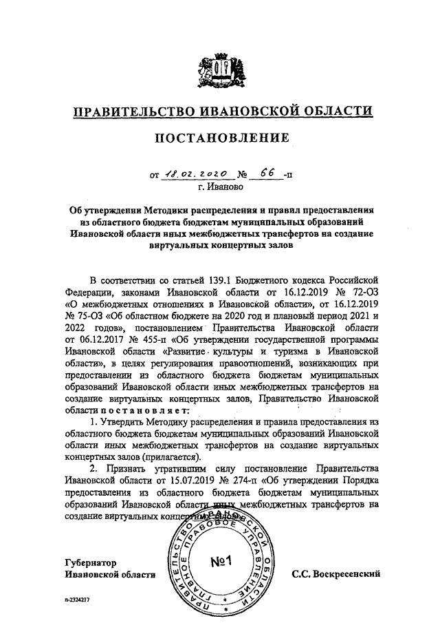 Постановление Правительства Ивановской области от 18.02.2020 N 66-п "Об утверждении Методики распределения и правил предоставления из областного бюджета бюджетам муниципальных образований Ивановской области иных межбюджетных трансфертов на создание виртуальных концертных залов"