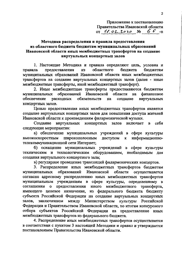 Постановление Правительства Ивановской области от 18.02.2020 N 66-п "Об утверждении Методики распределения и правил предоставления из областного бюджета бюджетам муниципальных образований Ивановской области иных межбюджетных трансфертов на создание виртуальных концертных залов"