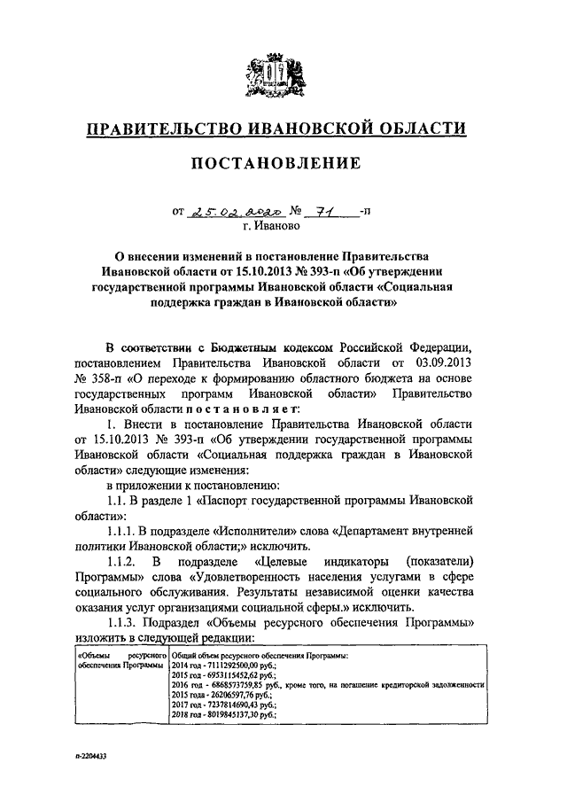 Постановление Правительства Ивановской области от 25.02.2020 N 71-п "О внесении изменений в постановление Правительства Ивановской области от 15.10.2013 N 393-п "Об утверждении государственной программы Ивановской области "Социальная поддержка граждан в Ивановской области"