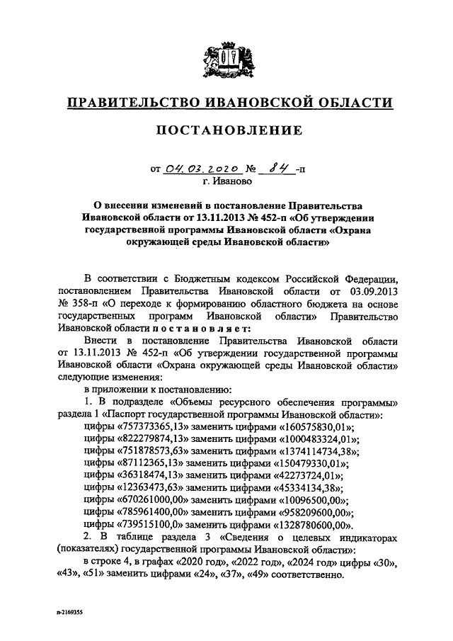 Постановление Правительства Ивановской области от 04.03.2020 N 84-п "О внесении изменений в постановление Правительства Ивановской области от 13.11.2013 N 452-п "Об утверждении государственной программы Ивановской области "Охрана окружающей среды Ивановской области" (вместе с "Порядком предоставления и распределения субсидий бюджетам муниципальных образований Ивановской области на сокращение доли загрязненных сточных вод", "Прогнозом тарифных последствий реализации мероприятий подпрограммы", "Порядком предоставления и распределения субсидий бюджетам муниципальных образований Ивановской области на разработку проектов работ по ликвидации накопленного вреда окружающей среде", "Порядком предоставления и распределения субсидий бюджетам муниципальных образований Ивановской области на ликвидацию наиболее опасных объектов накопленного экологического вреда окружающей среде", "Порядком предоставления и распределения субсидий бюджетам муниципальных образований Ивановской области на ликвидацию (рекультивацию) объектов накопленного экологического вреда, представляющих угрозу реке Волге")