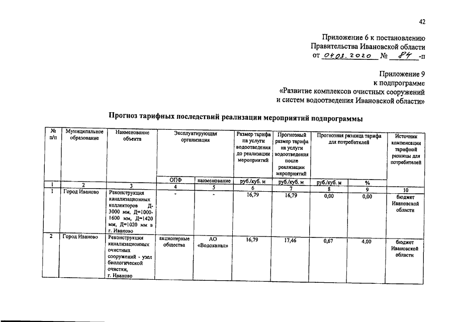 Постановление Правительства Ивановской области от 04.03.2020 N 84-п "О внесении изменений в постановление Правительства Ивановской области от 13.11.2013 N 452-п "Об утверждении государственной программы Ивановской области "Охрана окружающей среды Ивановской области" (вместе с "Порядком предоставления и распределения субсидий бюджетам муниципальных образований Ивановской области на сокращение доли загрязненных сточных вод", "Прогнозом тарифных последствий реализации мероприятий подпрограммы", "Порядком предоставления и распределения субсидий бюджетам муниципальных образований Ивановской области на разработку проектов работ по ликвидации накопленного вреда окружающей среде", "Порядком предоставления и распределения субсидий бюджетам муниципальных образований Ивановской области на ликвидацию наиболее опасных объектов накопленного экологического вреда окружающей среде", "Порядком предоставления и распределения субсидий бюджетам муниципальных образований Ивановской области на ликвидацию (рекультивацию) объектов накопленного экологического вреда, представляющих угрозу реке Волге")