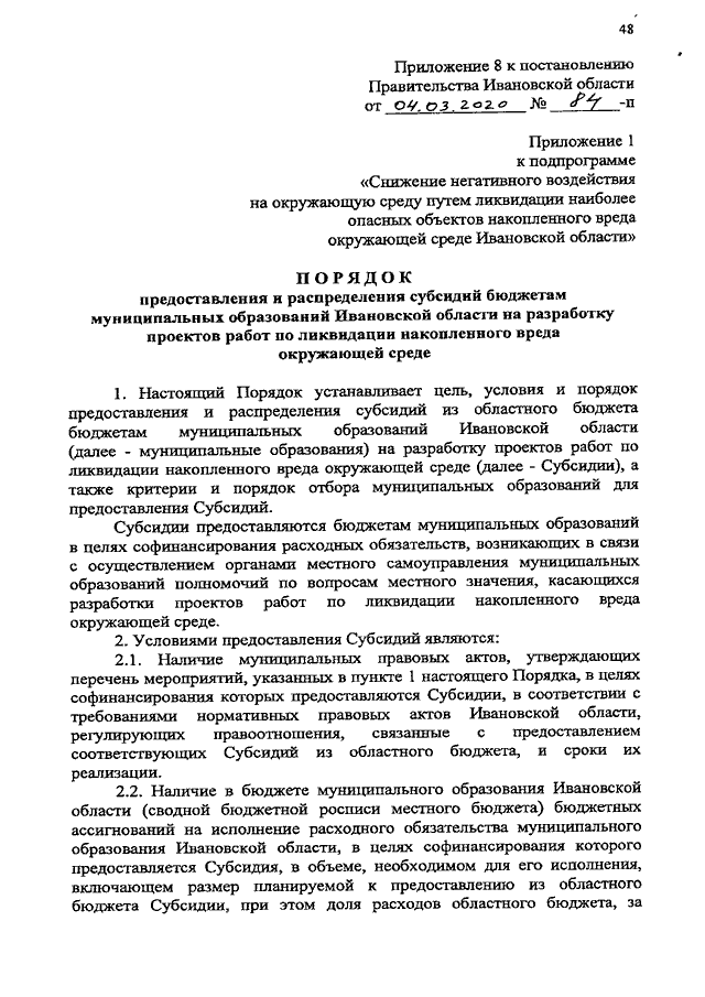 Постановление Правительства Ивановской области от 04.03.2020 N 84-п "О внесении изменений в постановление Правительства Ивановской области от 13.11.2013 N 452-п "Об утверждении государственной программы Ивановской области "Охрана окружающей среды Ивановской области" (вместе с "Порядком предоставления и распределения субсидий бюджетам муниципальных образований Ивановской области на сокращение доли загрязненных сточных вод", "Прогнозом тарифных последствий реализации мероприятий подпрограммы", "Порядком предоставления и распределения субсидий бюджетам муниципальных образований Ивановской области на разработку проектов работ по ликвидации накопленного вреда окружающей среде", "Порядком предоставления и распределения субсидий бюджетам муниципальных образований Ивановской области на ликвидацию наиболее опасных объектов накопленного экологического вреда окружающей среде", "Порядком предоставления и распределения субсидий бюджетам муниципальных образований Ивановской области на ликвидацию (рекультивацию) объектов накопленного экологического вреда, представляющих угрозу реке Волге")