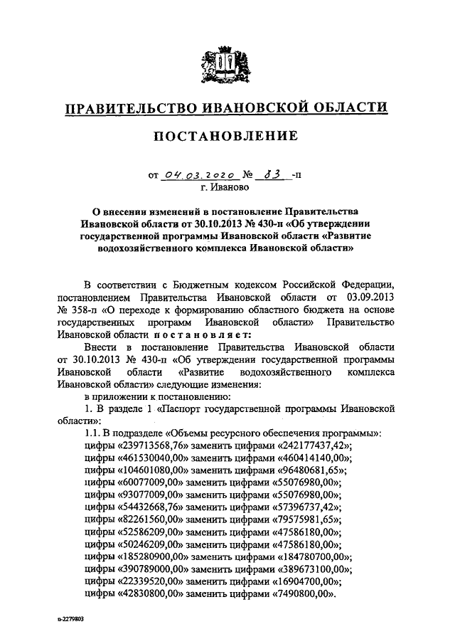Постановление Правительства Ивановской области от 04.03.2020 N 83-п "О внесении изменений в постановление Правительства Ивановской области от 30.10.2013 N 430-п "Об утверждении государственной программы Ивановской области "Развитие водохозяйственного комплекса Ивановской области" (вместе с "Порядком предоставления и распределения субсидий бюджетам муниципальных образований Ивановской области на восстановление и экологическую реабилитацию водных объектов, утративших способность к самоочищению, предотвращение истощения водных объектов, ликвидацию их засорения и загрязнения")