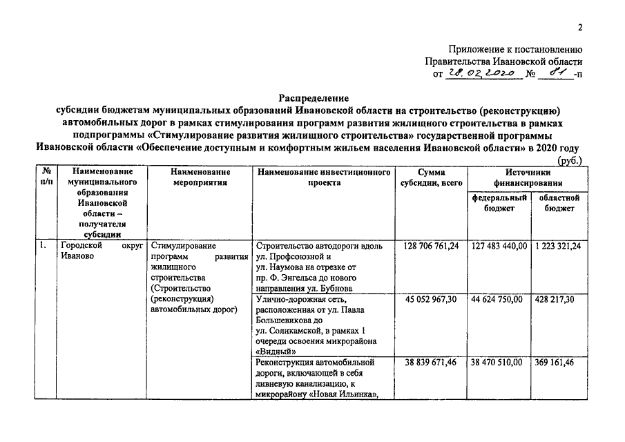 Постановление Правительства Ивановской области от 28.02.2020 N 81-п "О распределении субсидии бюджетам муниципальных образований Ивановской области на строительство (реконструкцию) автомобильных дорог в рамках стимулирования программ развития жилищного строительства в рамках подпрограммы "Стимулирование развития жилищного строительства" государственной программы Ивановской области "Обеспечение доступным и комфортным жильем населения Ивановской области" в 2020 году"