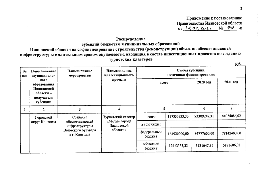 Постановление Правительства Ивановской области от 28.02.2020 N 79-п "О распределении субсидий бюджетам муниципальных образований Ивановской области на софинансирование строительства (реконструкции) объектов обеспечивающей инфраструктуры с длительным сроком окупаемости, входящих в состав инвестиционных проектов по созданию туристских кластеров"