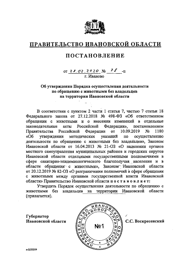 Постановление Правительства Ивановской области от 28.02.2020 N 78-п "Об утверждении Порядка осуществления деятельности по обращению с животными без владельцев на территории Ивановской области"