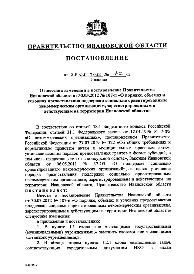 Постановление Правительства Ивановской области от 28.02.2020 N 77-п "О внесении изменений в постановление Правительства Ивановской области от 30.03.2012 N 107-п "О порядке, объемах и условиях предоставления поддержки социально ориентированным некоммерческим организациям, зарегистрированным и действующим на территории Ивановской области"