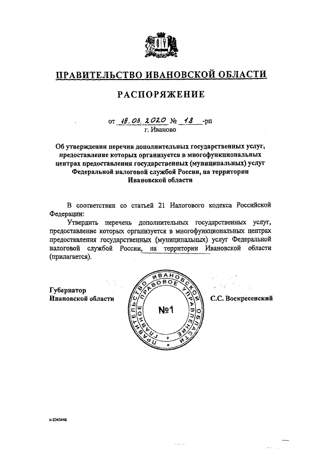 Распоряжение Правительства Ивановской области от 10.03.2020 N 18-рп "Об утверждении перечня дополнительных государственных услуг, предоставление которых организуется в многофункциональных центрах предоставления государственных (муниципальных) услуг Федеральной налоговой службой России, на территории Ивановской области"