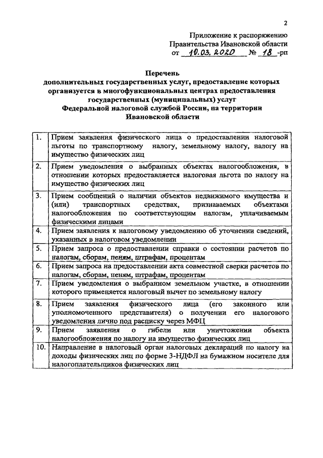 Распоряжение Правительства Ивановской области от 10.03.2020 N 18-рп "Об утверждении перечня дополнительных государственных услуг, предоставление которых организуется в многофункциональных центрах предоставления государственных (муниципальных) услуг Федеральной налоговой службой России, на территории Ивановской области"