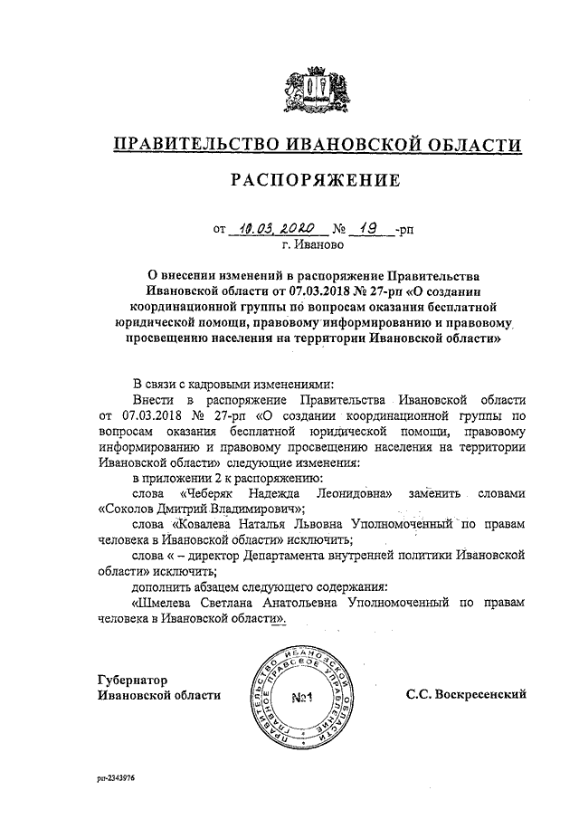 Распоряжение Правительства Ивановской области от 10.03.2020 N 19-рп "О внесении изменений в распоряжение Правительства Ивановской области от 07.03.2018 N 27-рп "О создании координационной группы по вопросам оказания бесплатной юридической помощи, правовому информированию и правовому просвещению населения на территории Ивановской области"