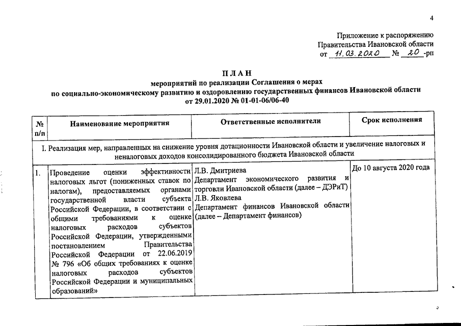 Распоряжение Правительства Ивановской области от 10.03.2020 N 20-рп "О реализации Соглашения о мерах по социально-экономическому развитию и оздоровлению государственных финансов Ивановской области" (вместе с "Планом мероприятий по реализации Соглашения о мерах по социально-экономическому развитию и оздоровлению государственных финансов Ивановской области от 29.01.2020 N 01-01-06/06-40")
