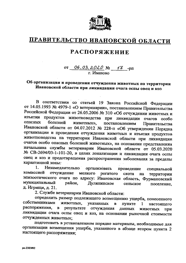 Распоряжение Правительства Ивановской области от 06.03.2020 N 17-рп "Об организации и проведении отчуждения животных на территории Ивановской области при ликвидации очага оспы овец и коз"