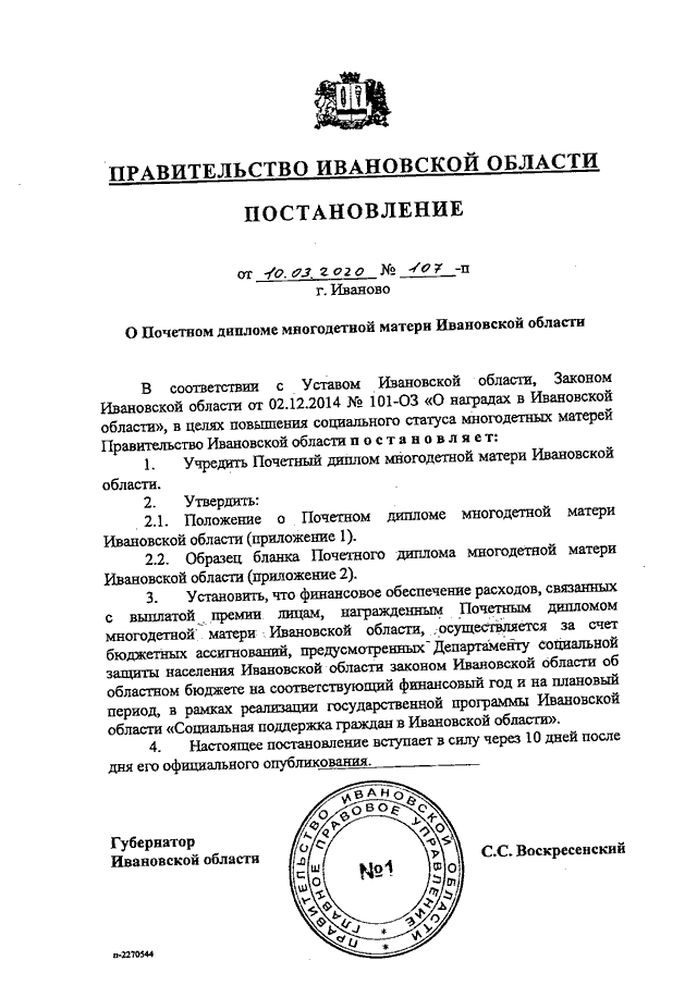 Постановление Правительства Ивановской области от 10.03.2020 N 107-п "О Почетном дипломе многодетной матери Ивановской области" (вместе с "Положением о Почетном дипломе многодетной матери Ивановской области")