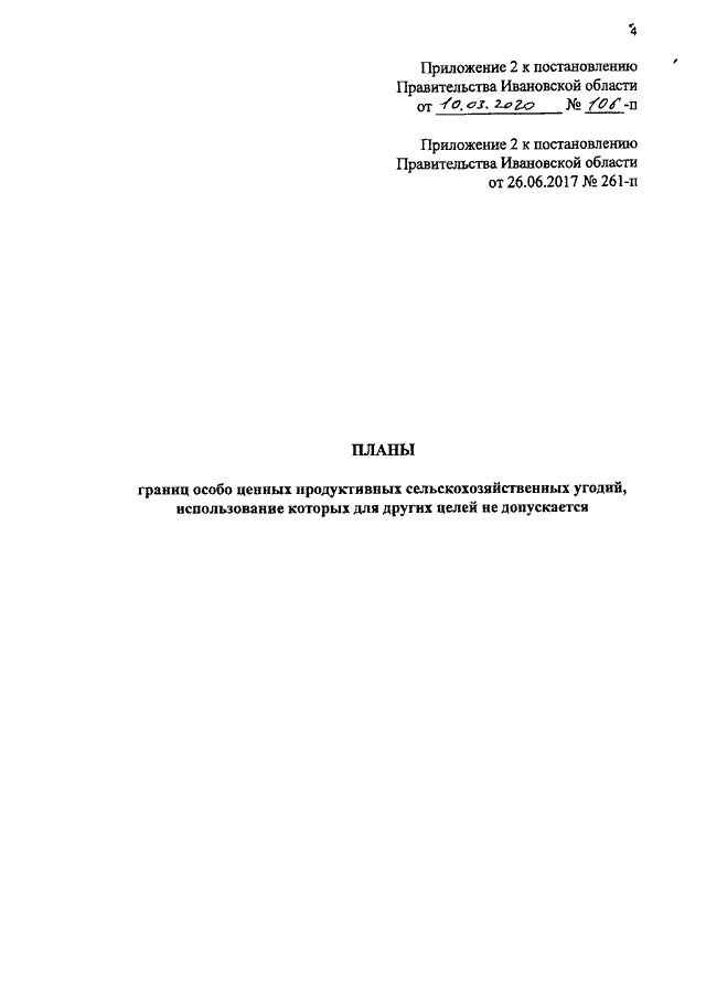 Постановление Правительства Ивановской области от 10.03.2020 N 106-п "О внесении изменений в постановление Правительства Ивановской области от 26.06.2017 N 261-п "Об утверждении перечня и планов границ особо ценных продуктивных сельскохозяйственных угодий, использование которых для других целей не допускается"