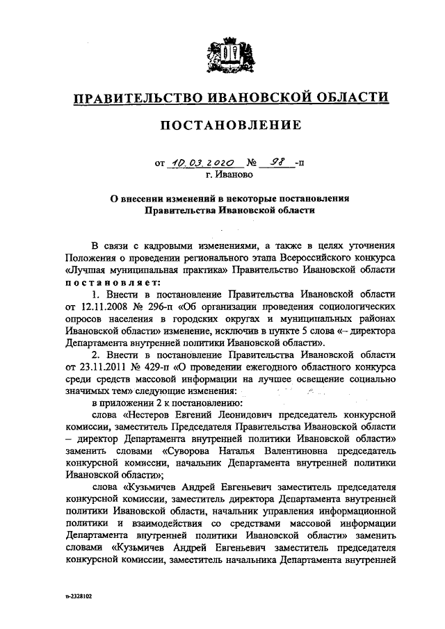 Постановление Правительства Ивановской области от 10.03.2020 N 98-п "О внесении изменений в некоторые постановления Правительства Ивановской области"