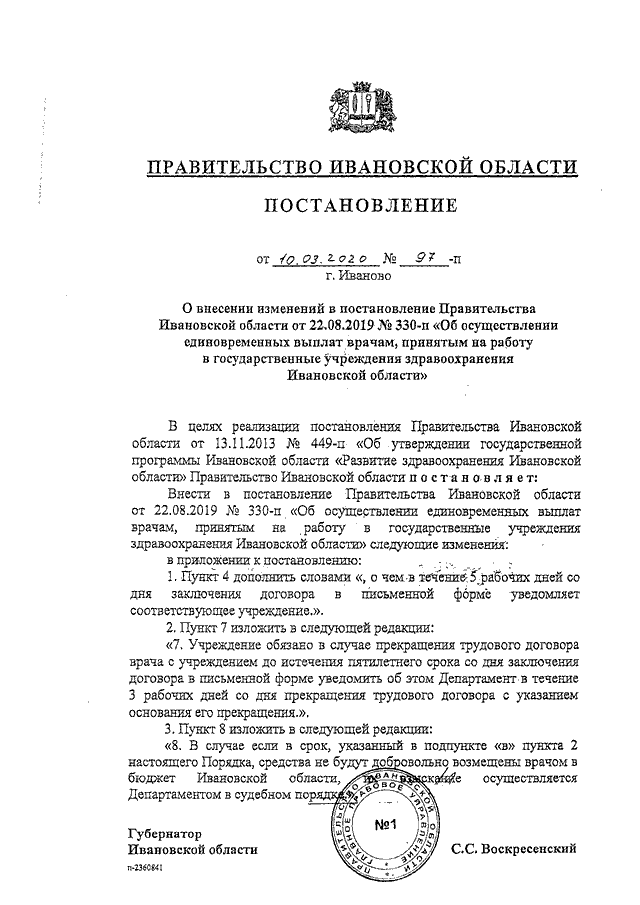 Постановление Правительства Ивановской области от 10.03.2020 N 97-п "О внесении изменений в постановление Правительства Ивановской области от 22.08.2019 N 330-п "Об осуществлении единовременных выплат врачам, принятым на работу в государственные учреждения здравоохранения Ивановской области"