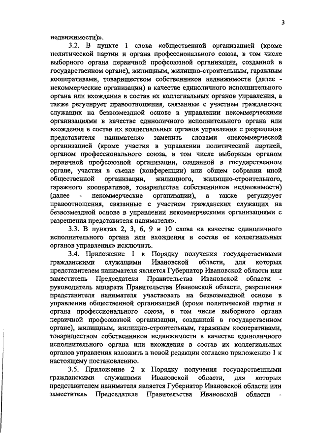 Постановление Правительства Ивановской области от 10.03.2020 N 93-п "О внесении изменений в постановление Правительства Ивановской области от 24.08.2017 N 333-п "Об утверждении Порядка получения государственными гражданскими служащими Ивановской области, для которых представителем нанимателя является Губернатор Ивановской области или заместитель Председателя Правительства Ивановской области - руководитель аппарата Правительства Ивановской области, разрешения представителя нанимателя участвовать на безвозмездной основе в управлении общественной организацией (кроме политической партии и органа профессионального союза, в том числе выборного органа первичной профсоюзной организации, созданной в государственном органе), жилищным, жилищно-строительным, гаражным кооперативами, товариществом собственников недвижимости в качестве единоличного исполнительного органа или вхождения в состав их коллегиальных органов управления"