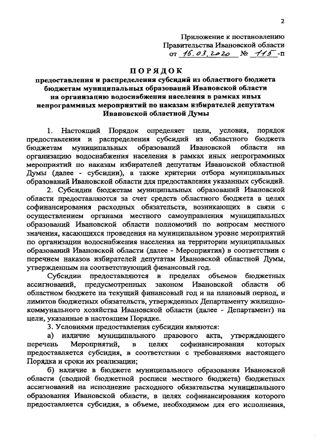 Постановление Правительства Ивановской области от 16.03.2020 N 115-п "Об утверждении Порядка предоставления и распределения субсидий из областного бюджета бюджетам муниципальных образований Ивановской области на организацию водоснабжения населения в рамках иных непрограммных мероприятий по наказам избирателей депутатам Ивановской областной Думы"