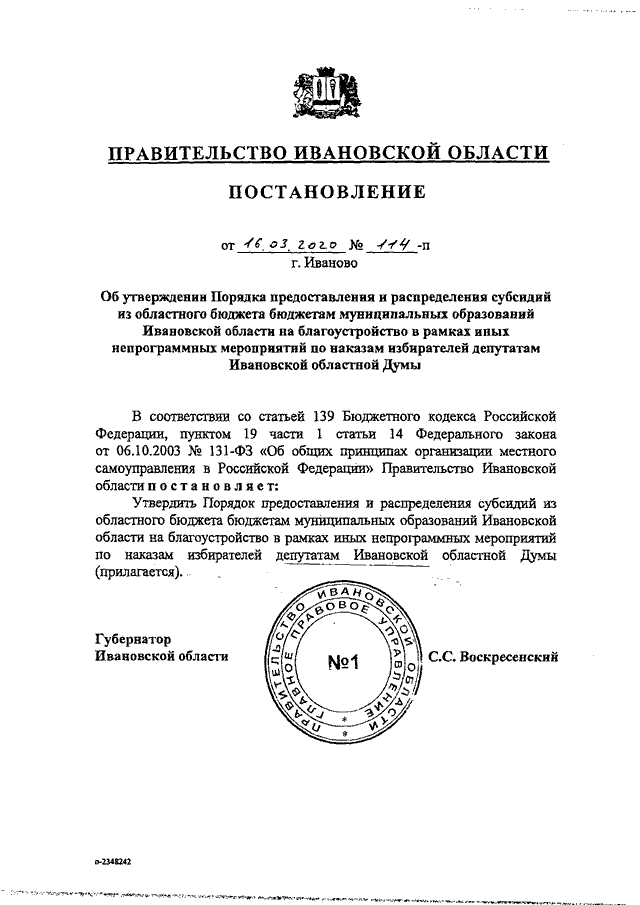 Постановление Правительства Ивановской области от 16.03.2020 N 114-п "Об утверждении Порядка предоставления и распределения субсидий из областного бюджета бюджетам муниципальных образований Ивановской области на благоустройство в рамках иных непрограммных мероприятий по наказам избирателей депутатам Ивановской областной Думы"