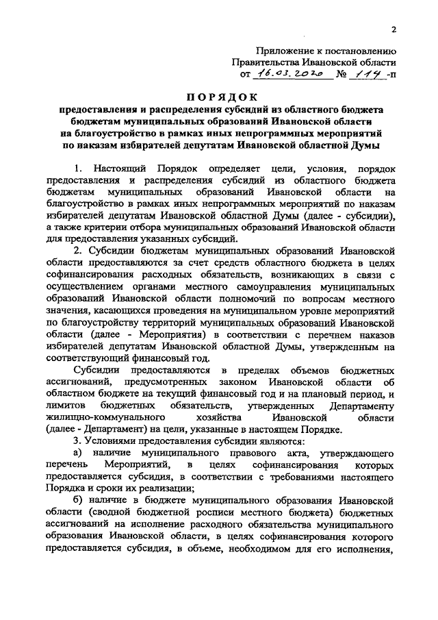 Постановление Правительства Ивановской области от 16.03.2020 N 114-п "Об утверждении Порядка предоставления и распределения субсидий из областного бюджета бюджетам муниципальных образований Ивановской области на благоустройство в рамках иных непрограммных мероприятий по наказам избирателей депутатам Ивановской областной Думы"