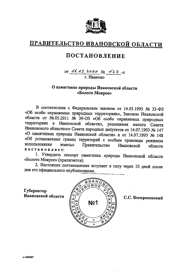 Постановление Правительства Ивановской области от 16.03.2020 N 122-п "О памятнике природы Ивановской области "Болото Мокрое" (вместе с "Паспортом памятника природы Ивановской области "Болото Мокрое")