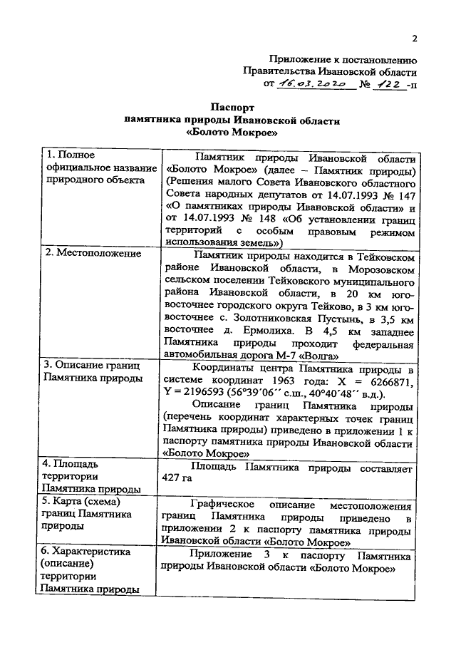 Постановление Правительства Ивановской области от 16.03.2020 N 122-п "О памятнике природы Ивановской области "Болото Мокрое" (вместе с "Паспортом памятника природы Ивановской области "Болото Мокрое")