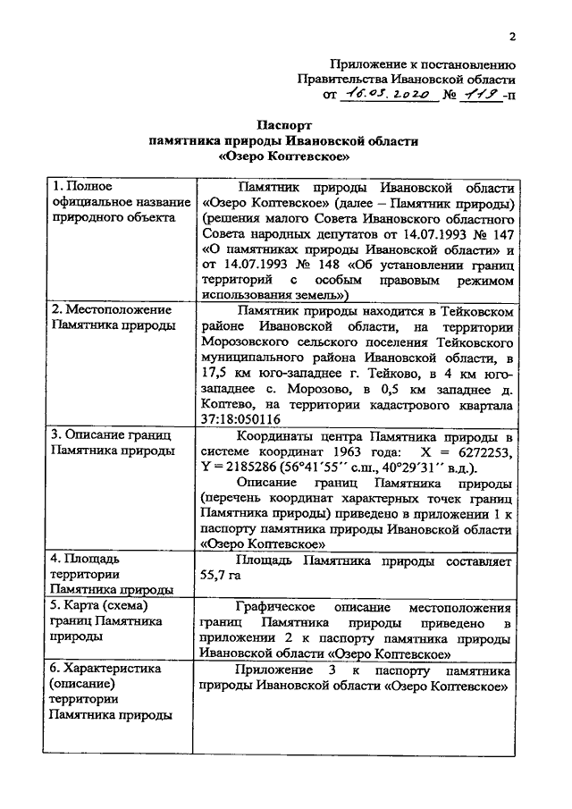 Постановление Правительства Ивановской области от 16.03.2020 N 119-п "О памятнике природы Ивановской области "Озеро Коптевское" (вместе с "Паспортом памятника природы Ивановской области "Озеро Коптевское")