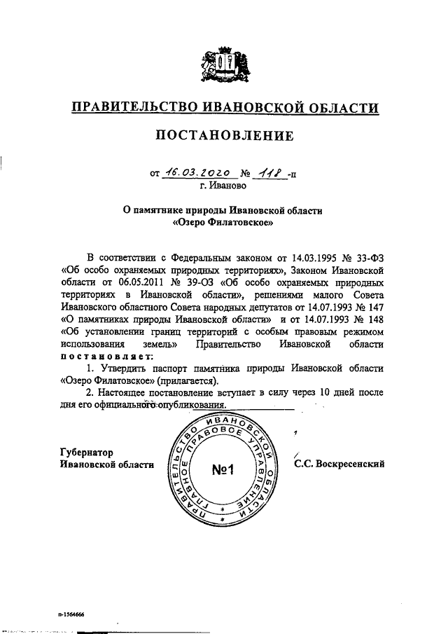 Постановление Правительства Ивановской области от 16.03.2020 N 118-п "О памятнике природы Ивановской области "Озеро Филатовское" (вместе с "Паспортом памятника природы Ивановской области "Озеро Филатовское")