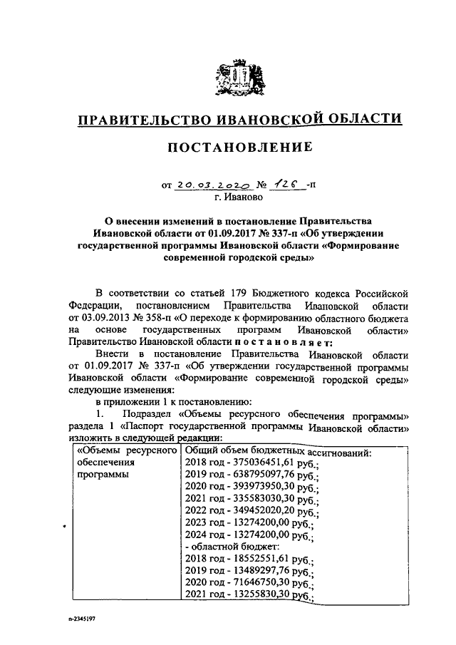 Постановление Правительства Ивановской области от 20.03.2020 N 126-п "О внесении изменений в постановление Правительства Ивановской области от 01.09.2017 N 337-п "Об утверждении государственной программы Ивановской области "Формирование современной городской среды" (вместе с "Порядком предоставления и распределения субсидий бюджетам муниципальных образований Ивановской области на реализацию проектов развития территорий муниципальных образований Ивановской области, основанных на местных инициативах")