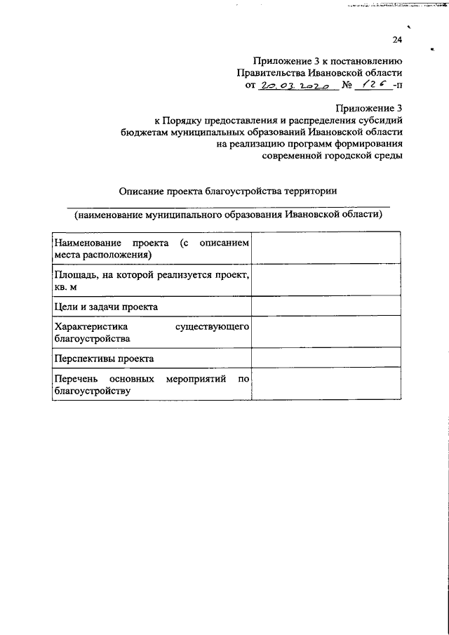Постановление Правительства Ивановской области от 20.03.2020 N 126-п "О внесении изменений в постановление Правительства Ивановской области от 01.09.2017 N 337-п "Об утверждении государственной программы Ивановской области "Формирование современной городской среды" (вместе с "Порядком предоставления и распределения субсидий бюджетам муниципальных образований Ивановской области на реализацию проектов развития территорий муниципальных образований Ивановской области, основанных на местных инициативах")