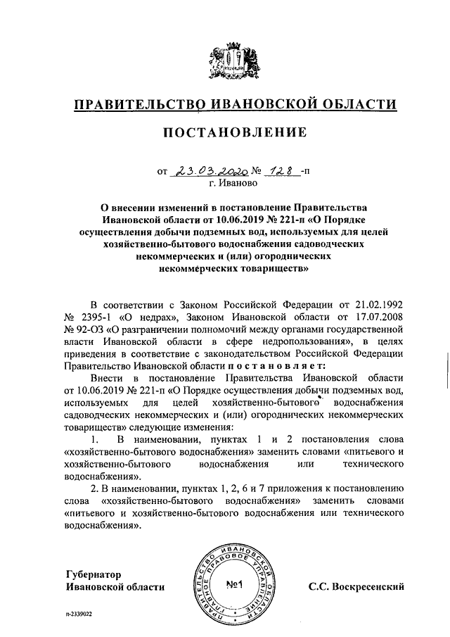 Постановление Правительства Ивановской области от 23.03.2020 N 128-п "О внесении изменений в постановление Правительства Ивановской области от 10.06.2019 N 221-п "О Порядке осуществления добычи подземных вод, используемых для целей хозяйственно-бытового водоснабжения садоводческих некоммерческих и (или) огороднических некоммерческих товариществ"