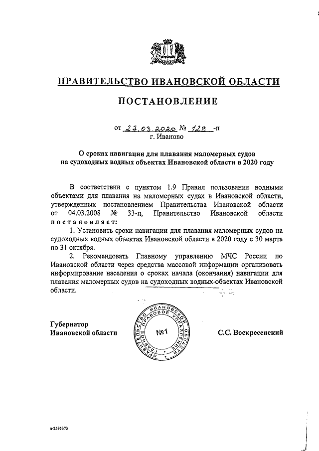 Постановление Правительства Ивановской области от 27.03.2020 N 129-п "О сроках навигации для плавания маломерных судов на судоходных водных объектах Ивановской области в 2020 году"