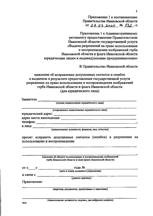 Постановление Правительства Ивановской области от 27.03.2020 N 132-п "О внесении изменений в постановление Правительства Ивановской области от 09.08.2012 N 296-п "Об утверждении административного регламента предоставления Правительством Ивановской области государственной услуги "Выдача разрешений на право использования и воспроизведения изображений герба Ивановской области и флага Ивановской области юридическим лицам и индивидуальным предпринимателям"