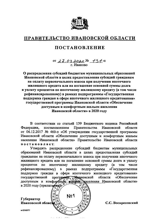 Постановление Правительства Ивановской области от 27.03.2020 N 131-п "О распределении субсидий бюджетам муниципальных образований Ивановской области в целях предоставления субсидий гражданам на оплату первоначального взноса при получении ипотечного жилищного кредита или на погашение основной суммы долга и уплату процентов по ипотечному жилищному кредиту (в том числе рефинансированному) в рамках подпрограммы "Государственная поддержка граждан в сфере ипотечного жилищного кредитования" государственной программы Ивановской области "Обеспечение доступным и комфортным жильем населения Ивановской области" в 2020 году"