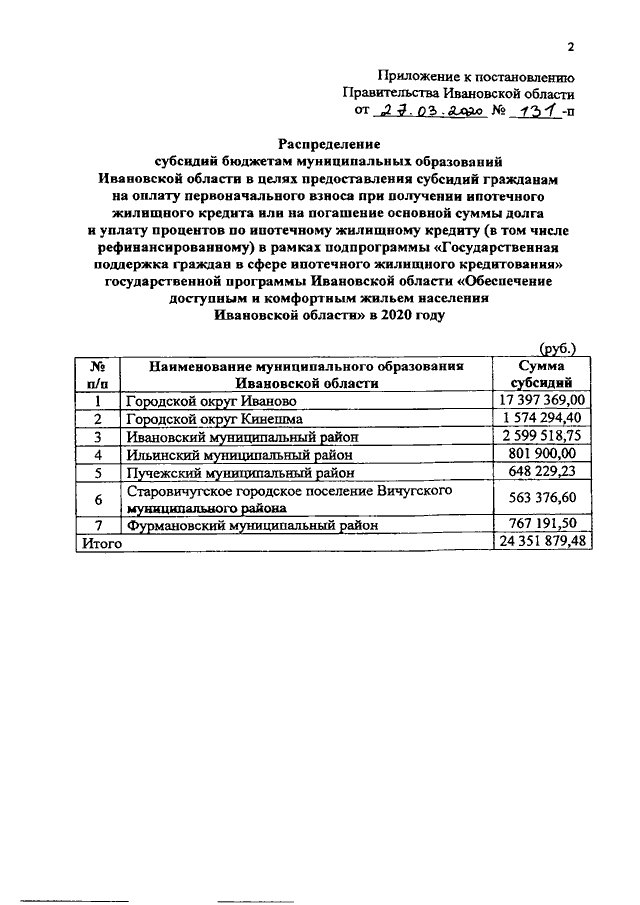 Постановление Правительства Ивановской области от 27.03.2020 N 131-п "О распределении субсидий бюджетам муниципальных образований Ивановской области в целях предоставления субсидий гражданам на оплату первоначального взноса при получении ипотечного жилищного кредита или на погашение основной суммы долга и уплату процентов по ипотечному жилищному кредиту (в том числе рефинансированному) в рамках подпрограммы "Государственная поддержка граждан в сфере ипотечного жилищного кредитования" государственной программы Ивановской области "Обеспечение доступным и комфортным жильем населения Ивановской области" в 2020 году"