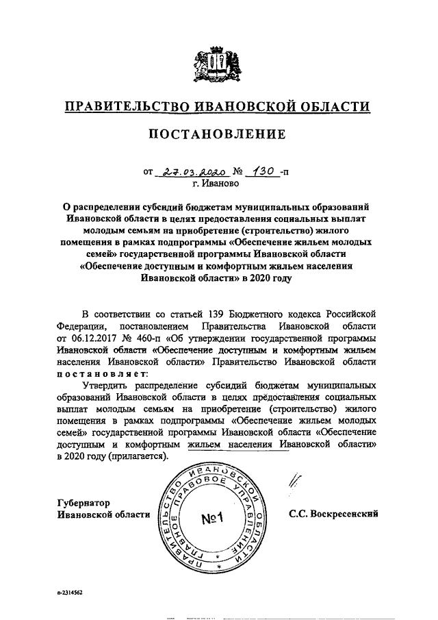 Постановление Правительства Ивановской области от 27.03.2020 N 130-п "О распределении субсидий бюджетам муниципальных образований Ивановской области в целях предоставления социальных выплат молодым семьям на приобретение (строительство) жилого помещения в рамках подпрограммы "Обеспечение жильем молодых семей" государственной программы Ивановской области "Обеспечение доступным и комфортным жильем населения Ивановской области" в 2020 году"