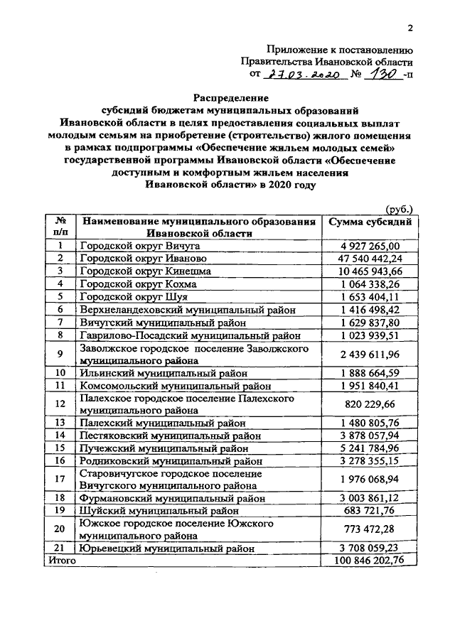 Постановление Правительства Ивановской области от 27.03.2020 N 130-п "О распределении субсидий бюджетам муниципальных образований Ивановской области в целях предоставления социальных выплат молодым семьям на приобретение (строительство) жилого помещения в рамках подпрограммы "Обеспечение жильем молодых семей" государственной программы Ивановской области "Обеспечение доступным и комфортным жильем населения Ивановской области" в 2020 году"