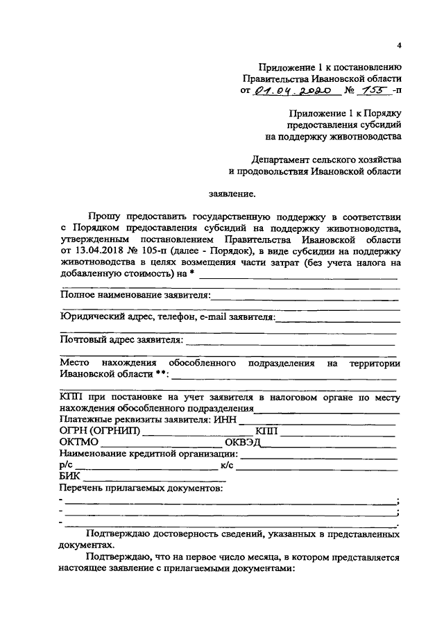 Постановление Правительства Ивановской области от 01.04.2020 N 155-п "О внесении изменений в постановление Правительства Ивановской области от 13.04.2018 N 105-п "Об утверждении Порядка предоставления субсидий на поддержку животноводства"