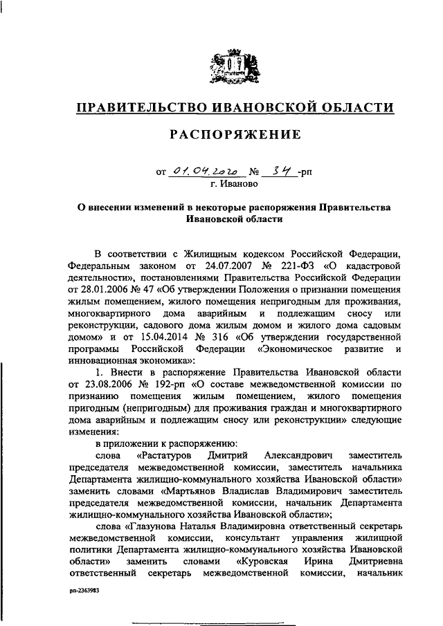 Распоряжение Правительства Ивановской области от 01.04.2020 N 34-рп "О внесении изменений в некоторые распоряжения Правительства Ивановской области"