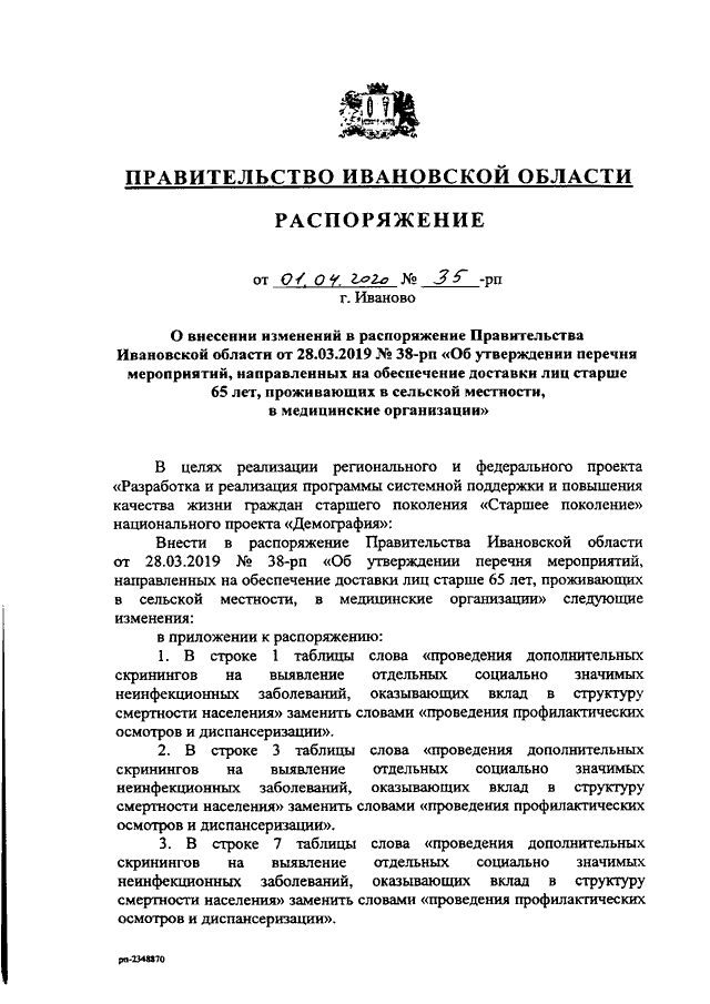Распоряжение Правительства Ивановской области от 01.04.2020 N 35-рп "О внесении изменений в распоряжение Правительства Ивановской области от 28.03.2019 N 38-рп "Об утверждении перечня мероприятий, направленных на обеспечение доставки лиц старше 65 лет, проживающих в сельской местности, в медицинские организации"