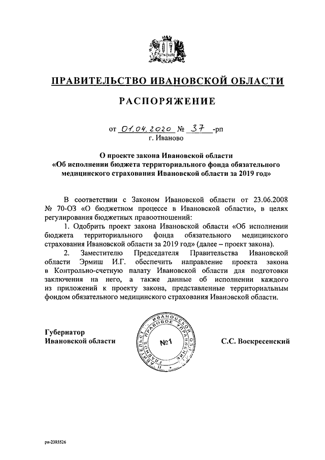 Распоряжение Правительства Ивановской области от 01.04.2020 N 37-рп "О проекте закона Ивановской области "Об исполнении бюджета территориального фонда обязательного медицинского страхования Ивановской области за 2019 год"