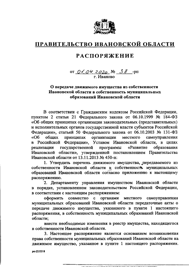 Распоряжение Правительства Ивановской области от 01.04.2020 N 38-рп "О передаче движимого имущества из собственности Ивановской области в собственность муниципальных образований Ивановской области"