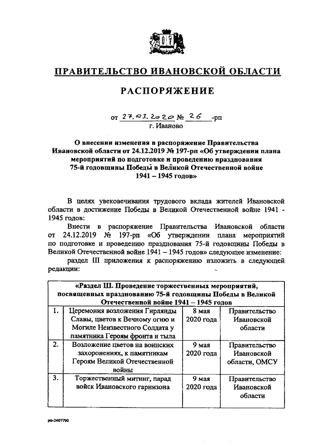 Распоряжение Правительства Ивановской области от 27.03.2020 N 26-рп "О внесении изменения в распоряжение Правительства Ивановской области от 24.12.2019 N 197-рп "Об утверждении плана мероприятий по подготовке и проведению празднования 75-й годовщины Победы в Великой Отечественной войне 1941 - 1945 годов"