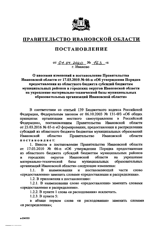 Постановление Правительства Ивановской области от 01.04.2020 N 163-п "О внесении изменений в постановление Правительства Ивановской области от 17.03.2010 N 66-п "Об утверждении Порядка предоставления из областного бюджета субсидий бюджетам муниципальных районов и городских округов Ивановской области на укрепление материально-технической базы муниципальных образовательных организаций Ивановской области"