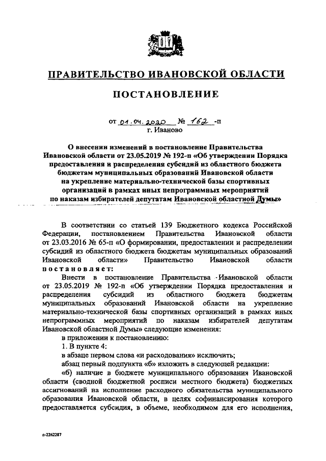 Постановление Правительства Ивановской области от 01.04.2020 N 162-п "О внесении изменений в постановление Правительства Ивановской области от 23.05.2019 N 192-п "Об утверждении Порядка предоставления и распределения субсидий из областного бюджета бюджетам муниципальных образований Ивановской области на укрепление материально-технической базы спортивных организаций в рамках иных непрограммных мероприятий по наказам избирателей депутатам Ивановской областной Думы"