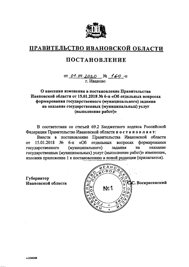Постановление Правительства Ивановской области от 01.04.2020 N 160-п "О внесении изменения в постановление Правительства Ивановской области от 15.01.2018 N 6-п "Об отдельных вопросах формирования государственного (муниципального) задания на оказание государственных (муниципальных) услуг (выполнение работ)" (вместе с "Порядком формирования, ведения и утверждения регионального перечня (классификатора) государственных (муниципальных) услуг, не включенных в общероссийские базовые (отраслевые) перечни (классификаторы) государственных и муниципальных услуг, и работ, оказание и выполнение которых предусмотрено нормативными правовыми актами Ивановской области (муниципальными правовыми актами)")