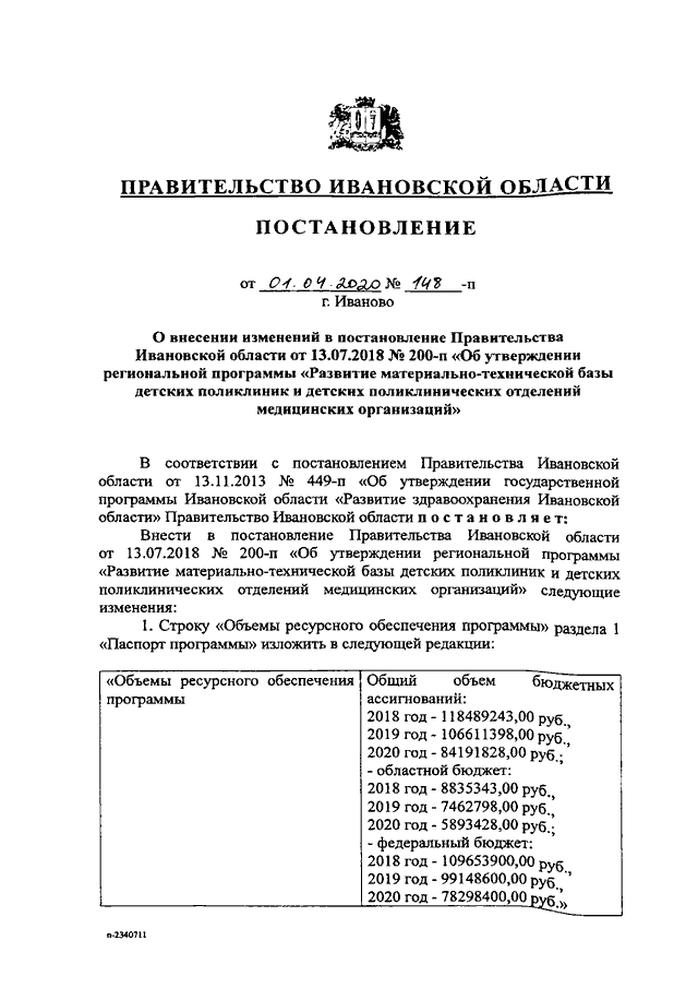 Постановление Правительства Ивановской области от 01.04.2020 N 148-п "О внесении изменений в постановление Правительства Ивановской области от 13.07.2018 N 200-п "Об утверждении региональной программы "Развитие материально-технической базы детских поликлиник и детских поликлинических отделений медицинских организаций"