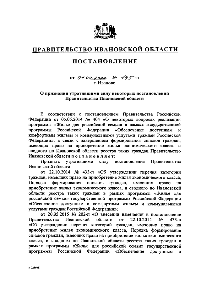 Постановление Правительства Ивановской области от 01.04.2020 N 145-п "О признании утратившими силу некоторых постановлений Правительства Ивановской области"