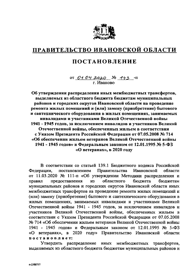 Постановление Правительства Ивановской области от 01.04.2020 N 143-п "Об утверждении распределения иных межбюджетных трансфертов, выделяемых из областного бюджета бюджетам муниципальных районов и городских округов Ивановской области на проведение ремонта жилых помещений и (или) замену (приобретение) бытового и сантехнического оборудования в жилых помещениях, занимаемых инвалидами и участниками Великой Отечественной войны 1941 - 1945 годов, за исключением инвалидов и участников Великой Отечественной войны, обеспеченных жильем в соответствии с Указом Президента Российской Федерации от 07.05.2008 N 714 "Об обеспечении жильем ветеранов Великой Отечественной войны 1941 - 1945 годов" и Федеральным законом от 12.01.1995 N 5-ФЗ "О ветеранах", в 2020 году"