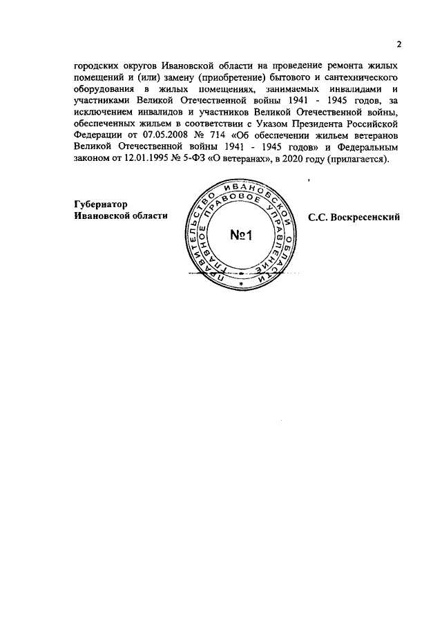 Постановление Правительства Ивановской области от 01.04.2020 N 143-п "Об утверждении распределения иных межбюджетных трансфертов, выделяемых из областного бюджета бюджетам муниципальных районов и городских округов Ивановской области на проведение ремонта жилых помещений и (или) замену (приобретение) бытового и сантехнического оборудования в жилых помещениях, занимаемых инвалидами и участниками Великой Отечественной войны 1941 - 1945 годов, за исключением инвалидов и участников Великой Отечественной войны, обеспеченных жильем в соответствии с Указом Президента Российской Федерации от 07.05.2008 N 714 "Об обеспечении жильем ветеранов Великой Отечественной войны 1941 - 1945 годов" и Федеральным законом от 12.01.1995 N 5-ФЗ "О ветеранах", в 2020 году"